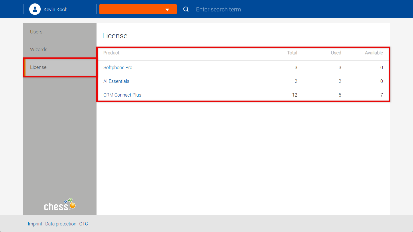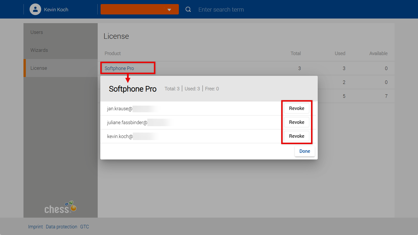 Click on a product (in the example here: Softphone Pro) to see which users have licenses.
